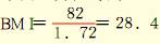 判断标准:男性:21~24为正常;女性:20~24为正常;24~26为过重;26~29为轻度肥胖;29~32为中度肥胖;>32为重度肥胖。