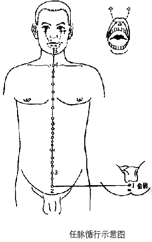 1.循行部位:任脉起于胞中,下出于会阴,经阴阜,沿腹部正中线上行,经咽喉部(天突穴),到达下唇内,左右分行,环绕口唇,交会于督脉之龈交穴,再分别通过鼻翼两旁,上至眼眶下(承泣穴),交于足阳明经。