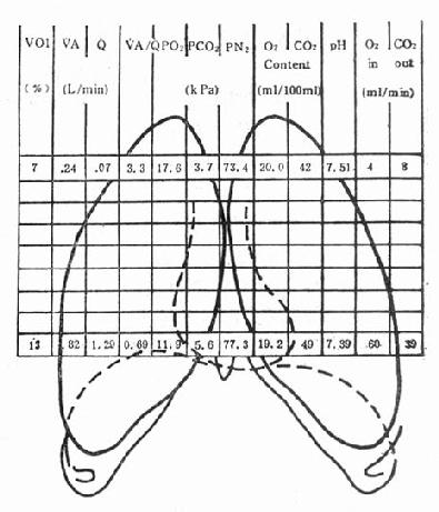 如图3-11所示,肺尖部的通气量低,血流量也少,其相应比值为3.3,是为高