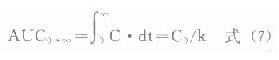 药动学中积分法求算的AUC,均表示曲线随时间无限外延,直至体内药量完全消除时的面积。此外式⑺仅适用于单室模型、一级消除动力学单剂静脉注射给药的情况。