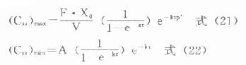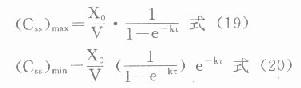 静脉注射时,每次间隔中波动的峰值总是在每次注射完的瞬间(t=0),而谷值则在下次注射前(t=τ)出现,分别代入⒄式可得静脉注射多剂用药时