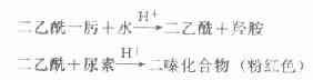 ⑵二乙酰一肟法(直接法):尿素可与二乙酰作用,在强酸加热的条件下,生成粉红色的二嗪化合物(Fearom反应),在540nm比色,其颜色强度与尿素含量成正比。二乙酰不稳定,用二乙酰一肟代替,后者遇酸水解成二乙酰。