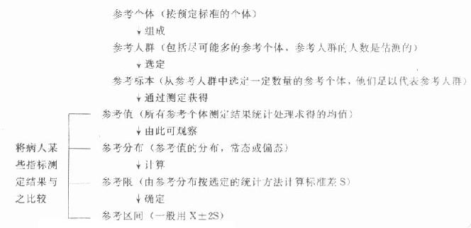 制定参考值(referencevalues)时,首先要阅读有关资料,依照经典的文献作为研究设计的依据,使设计尽量合理,结果令人信服,有实用价值。1978年,国际临床化学委员会下属的“参考值”理论专家组发表专门文件,推荐出一套有关参考值的概念、定义、建立和使用方案。参考值的建立应包括参考个体、参考人群、参考标本、参考值、参考分布、参考限和参考区间。它们之间的关系如下:
