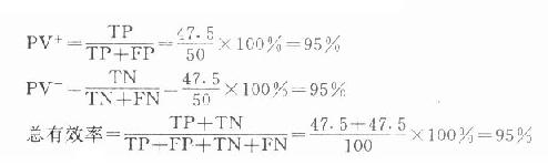 在临床应用中,主要以阳性结果的预示值观察实验结果的使用价值。但在固定参考范围的条件下,对不同发病率的人群进行相同指标检测时,所得到的预示值会有很大变化。例如用某方法对某专科病房检测100个标本,发病率为50%,方法诊断灵敏度为95%,诊断特异性为95%。由此数据可知: