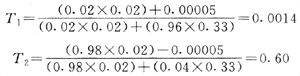 根据以往资料得到治疗的效益(B),治疗的危险性(R2),检查的危险性(R1),检查的真阳性率(TP),真阴性率(TN),假阳性率(FP)和假阴性率(FN),按下式计算T1,T2