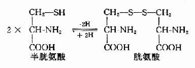 1.半胱氨酸和胱氨酸的互变 半胱氨酸含巯基(-SH),胱氨酸含有二硫键(S-S-),二者可通过氧化还原而互变。胱氨酸不参与蛋白质的合成,蛋白质中的胱氨酸由半胱氨酸残基氧化脱氢而来。在蛋白质分子中两个半胱氨酸残基间所形成的二硫键对维持蛋白质分子构象起重要作用。而蛋白分子中半胱氨酸的巯基是许多蛋白质或酶的活性基团。