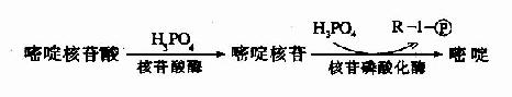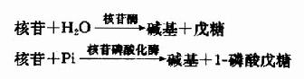 食物中的核酸多与蛋白质结合为核蛋白,在胃中受胃酸的作用,或在小肠中受蛋白酶作用,分解为核酸和蛋白质。核酸主要在十二指肠由胰核酸酶(pancreatic nucleases)和小肠磷酸二酯酶(phosphodiesterases)降解为单核苷酸。核苷酸由不同的碱基特异性核苷酸酶(nucleotidases)和非特异性磷酸酶(phosphatases)催化,水解为核苷和磷酸。核苷可直接被小肠粘膜吸收,或在核苷酶(nucleosidases)和核苷磷酸化酶(nucleoside phosphorylases)作用下,水解为碱基,戊糖或1-磷酸戊糖:
