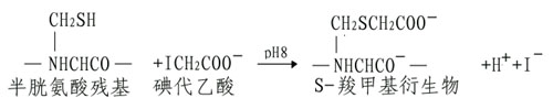 如果碘代乙酰胺代替碘代乙酸,其产物S羧氨甲基衍生物不带电荷,磺代乙酸也可与组氨酸、蛋氨酸和赖氨酸发生反应,但反应条件不同,可通过各种pH及反应时间进行控制。