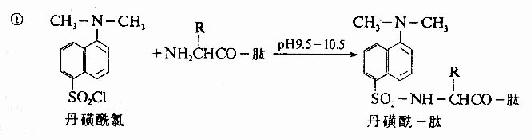 C.二甲基氨基萘磺酰氯法:1956年Hartley等报告了一种测定N-末端的灵敏方法,采用1-二甲基氨基萘-5-磺酰氯,简称丹磺酰氯。它与游离氨基末端作用,方法类似于Sanger的DNFB法,产物是磺酰胺衍生物。