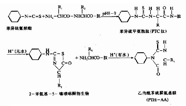这是目前用于顺序分析的最主要的方法。它的原理是从N端开始,逐步降解。将肽先与异硫氰酸苯酯(PTH试剂)在pH8-9条件下作用,肽的NH2末端接到异硫氰酸苯酯的C原子上生成苯异硫甲氨酰肽,简称PTC肽,在强酸作用下,可使靠近PTC基的氨基酸环化,肽键断裂形成苯氨基噻唑啉酮衍生物和一个失去末端氨基酸的肽链。此肽不被破坏,因而又可出现一个新的N-末端。重复以上的步骤,继续与PTH试剂作用,继续分析,苯氨基噻唑啉酮衍生物很容易由有机溶剂抽提出来进行鉴定。但此衍生物很不稳定,在水中可转化为稳定的乙内酰苯硫脲氨基酸(PTH-氨基酸)。这些步骤通常称为Edman氏逐步降解法。所以可用来测定氨基酸的排列顺序。Edman降解法的优点是样品用量少,灵敏度高。