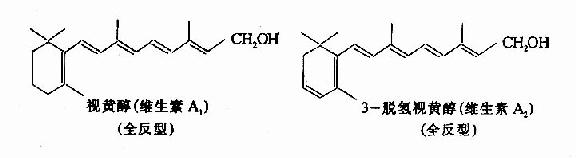 维生素A的侧链含有4个双链,故可形成多种顺反异构体,其中较重要的有全反型(AⅡ-trans)和Ⅱ-顺型(11-cis)。视黄醇在体内可被氧化成视黄醛(retinal),此反应是可逆的。