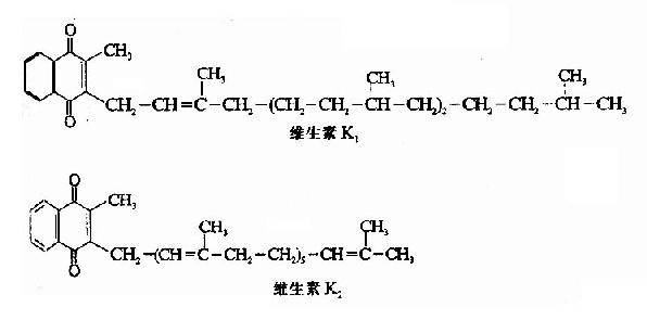 维生素K是2-甲基1,4-萘醌的衍生物,自然界已发现的有两种,存于绿叶植物中者为维生素K1,肠道细菌合成者为维生素K2,它们的结构如下。