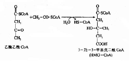 在3-羟-3-甲基戊二酰CoA(hydroxy methyl glutarylCoA,HMGCoA)合成酶催化下,乙酰乙酰CoA再与一分子乙酰CoA反应,生成HMGCoA,并释放出一分子辅酶。这一步反应是酮体生成的限速步骤。