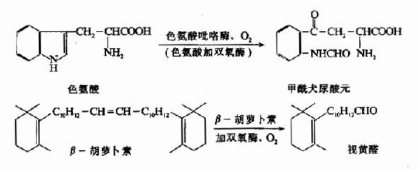 (2)加双氧酶 此酶催化O2分子中的两个原子分别加到底物分子中构成双键的两个碳原子上,如色氨酸吡咯酶(色氨酸加双氧酶)、胡萝卜素加双氧酶分别催化下述反应: