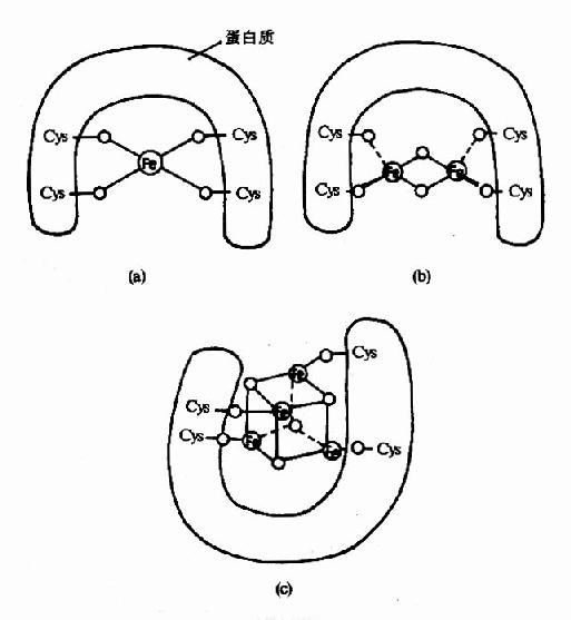 (a)单个铁与半胱氨酸硫相连 (b)2Fe-2S (c)4Fe-4S