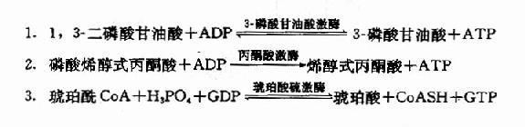 底物分子中的能量直接以高能键形式转移给ADP生成ATP,这个过程称为底物水平磷酸化,这一磷酸化过程在胞浆和线粒体中进行,包括有: