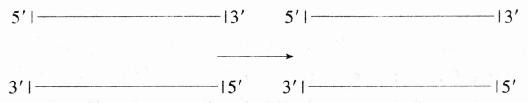 垂直虚线表示中心对称轴,从两侧“读”核苷酸顺序都是GAATTC或CTTAAG,这就是回文顺序(palindrome)。实线剪头表示在双链上交错切割的位置,切割后生成5’……G和AATTC……3’、3’……CTTAA和G……5’二个DNA片段,各有一个单链末端,二条单链是互补的,可通过形成氢键而“粘合”。另一种是在同一位置上切割双链,产生平头末端。例如HaeⅢ的识别位置是:
