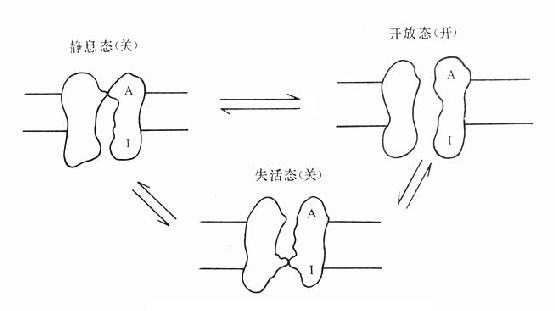 1.钙信道的三种功能状态 电压门控性钙通道受电压调控,在不同电压影响下,通道发生构象变化而表现出不同功能状态。一般设想它有双重门控系统即激活门与失活门,并有三种功能状态即静息态,开放态和失活态(图21-3)。静息态时通道关闭,Ca2+不能通过,通道的激活门关闭而失活门打开,此时,通道小孔被激活门所闭。细胞兴奋除极时通道转为开放态,Ca2+内流,此时,激活门开放,失活门由开放而缓慢趋于关闭,通道小孔开放。随后是失活态,通道关闭,Ca2+不能通过,此时,失活门关闭,激活门由开放而趋于关闭,小孔为失活门所闭。失活是恢复过程,经静息态为下次除极后的开放作好准备。一般,钙拮抗药与静息态的亲和性较低,而对其他状态作用较显著,如维拉帕米作用于开放态,地尔硫
