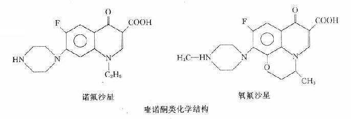 本类药物的构效关系研究表明:4-喹诺酮母核的3位均有羧酸基,6位引入氟原子可增强抗菌作用并对金葡菌有抗菌活性;7位引进哌嗪环可提高对金葡菌及绿脓杆菌的抗菌作用(如诺氟沙星),哌嗪环被甲基哌嗪环取代(如培氟沙星),则脂溶性增加,肠道吸收增强,细胞的穿透性提高,半衰期延长。在8位引进第二个氟原子,可进一步提高肠道吸收,延长半衰期(如洛美沙星等),N-1修饰以环丙基团(环丙沙星)或噁嗪基团(氧氟沙星)可扩大抗菌谱,增强对衣原体、支原体及分支杆菌(结核杆菌与麻风杆菌等)的抗菌活性,噁嗪环还可提高水溶性,使药物在体内不被代谢,以原形经尿排泄。