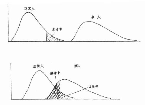 (2)正常人和病人的数据分布有重叠(见图5.4b)。这时两分布重叠部分内既有病人亦有正常人,若欲减少α,界值向右移,那么β将加大;若欲减少β,界值向左移,那么α将加大。通常兼顾α及β,取两曲线交点的横座标为界值,这时α与β之和为最小。但实用时还要考虑该正常值范围的主要用途,若用以普查初筛病人,则要减少假阴性,取80%或90%正常值范围;若用以确诊病人,则要避免假阳性,以取95%或99%正常值范围为宜。