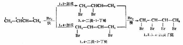 加第一分子溴的速率要比加第二分子溴快得多,反应常常终止在二溴代物阶段。而且生成的二溴代物也不是一种而是两种:3,4-二溴-1-丁烯和1,4-二溴-2-丁烯。3,4-二溴-1-丁烯是由溴和一个双键加成而生成的1,2-加成产物。1,4-二溴-2-丁烯是溴加在共轭双键两端而生成的1,4-加成产物。