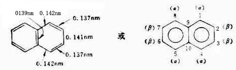 萘的分子式为C10H8。通过X射线测定萘分子的结构,证明萘分子具有平面结构。两个苯环共享两个碳原子互相稠合在一起,碳碳键的键长既不同于典型的单键和双键,届不同于苯分子中的碳碳键。萘的构造式及各键的键长如下: