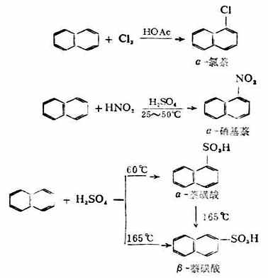 萘可发生与苯类似的亲电反应,一般在α-C上进行。例如,卤代和硝化反应。磺化则根据温度不同。例如:
