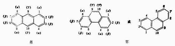1,4,5,8位置相同,称为α位;2,3,6,7位置相同,称为β位;9和10位置相同,称为γ位。蒽和菲具有一定的不饱和性,在一定的条件下也可被氧化。