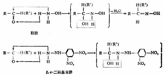 醛、酮与2,4-二硝基苯肼作用生成的2,4-二硝基苯腙是黄色结晶,具有一定的熔点,反应也很明显,便于观察,所以常被用来鉴别醛、酮。其它反应的产物肟、腙大都也是具有一定熔点的晶体,亦可用来鉴别醛、酮。因此,把这些氨的衍生物称为羰基试剂(即检验羰基的试剂)。