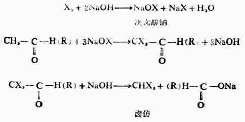 含有活泼甲基的醛或酮与卤素的碱溶液作用,三个α氢原子都被卤素取代,但生成的α,α,α三卤代物在碱性溶液中不稳定,立即分解成三卤甲烷(卤仿)和羧酸盐。
