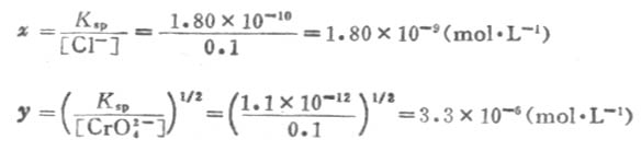解:设混合液中产生AgCL沉淀时,所需[Ag+]为x mol·L-1,而产生Ag2CrO4沉淀时,所需[Ag+]为y mol·L-1;已知AgCL的Ksp=1.80×10-10,Ag2CrO4的Ksp=1.1×10-12.