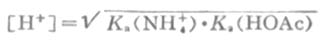 根据数学推导,当cKa(NH4+)>20Kw,且c〈20Ka(HOAc)时,计算溶液[H+]的近似公式为: