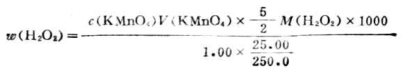 用移液管吸取市售过氧化氢1.00ml,放入250ml容量瓶中,稀释25.00ml于锥形瓶中,加6ml3mol·L-1H2SO4,用KMnO4标准溶液滴定溶液呈粉红色,设稀释后H2O2的密度为1,H2O2的含量可按下式计算: