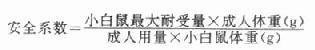 安全系数=小白鼠最大耐受量×成人体重(g)/成人用量×小白鼠体重(g)。