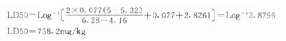 | 组别 | 剂量(mg/kg) | 剂量对数(X) | 鼠数 | 三天内死亡数 | 死亡率(%) | 机率单位(y) | 机率单位平均值(y) | 两剂量比值的对数(i) |