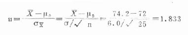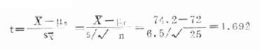 据题意,可把大量调查所得的均数72次/分与标准差6.0次/分看作为总体均数μ0和总体标准差σ,样本均数x为74.2次/分,样本例数n为25。