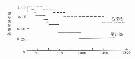查x2值表,x20.05(1)=3.84,今x2>4.675,P<0.05,表明两法累计缓解率曲线的差别有统计学意义。