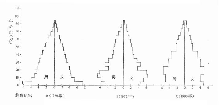 案例根据1953、1982和1990年三次全国人口普查资料,按性别和年龄分组统计,绘成图24-1如下。根据该图动态变化反映了如下重要问题: