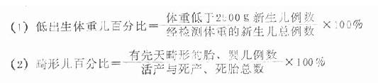 儿童和青少年身心发育水平,是衡量居民健康状况、研究环境对人群影响的重要指标;它与社会经济和营养条件关系密切,是评价医疗保健措施效果的重要方面。统计指标包括生长发育形态指标、生理功能指标和体能指标等方面。在妇幼卫生工作中还常用低出生体重儿百分比和畸形儿百分比等。所谓低出生体重儿(low birth weight infant)是指活产儿体重不满2500g者;低出生体重儿在婴儿期死亡率很高。例如纽约市1968年统计低出生体重儿在婴儿期死亡率达140.5‰,而2500~3000g者为12.1‰,3000g及以上者仅5.6~8.0‰。高山大气氧分压低,妊娠期母体缺氧可导致低出生体重儿的百分比增高,据西藏人民医院于1978年统计1767例新生儿体重,2500g以下者占28.24%,显著高于同年上海市报告为4.8%的水平,而与Lichby(1975)报告在海拔3050米高的原低出生体重儿占30.8%相近。以上两项指标计算式为: