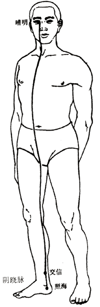 3.交会腧穴;照海、交信(足少阴经)、晴明(足太阳经)。