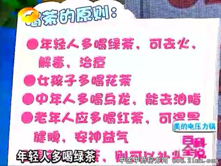 湖南卫视百科全说 2011年3月9日节目请来中医师,中国中医研究医学院硕士漆浩,就如何健康喝茶的学问,向全国电视观众做了讲解。 年轻人多喝绿茶,可去火,解毒,治痘。 女孩子多喝花茶 中年人多喝乌龙,能去油脂 老年人应多喝红茶,可温胃健脾,安神益气 黑茶和红茶可以补肾