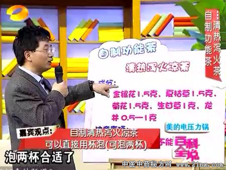 百科全说 漆浩 清热泻火凉茶 金银花1.5克,夏枯草1.5克,菊花1.5克,生甘草1克,龙井0.5-1克 |