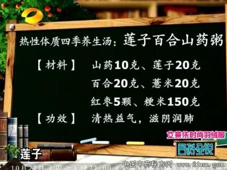 百科全说常海沧 介绍热性体质可服用四季养生汤:莲子百合山药粥 材料:山药10g、莲子20g、百合20g、薏米20g、红枣5颗、粳米150g。 功效:清热益气,滋阴润肺。 莲子百合山药粥 做法: 1、将山药、薏米、百合、莲子放入温水中泡2个小时(也可在前一天晚上用清水泡下) 2、莲子去芯、去皮; 3、粳米用冷水浸泡半小时,让米粒膨胀开; 4、薏米、莲子先下大火煮开5分钟后,加入山药、薏米、红枣、粳米大火煮沸,转小火 5、煮50分钟左右关火,可加适量糖或蜂蜜即可食用。