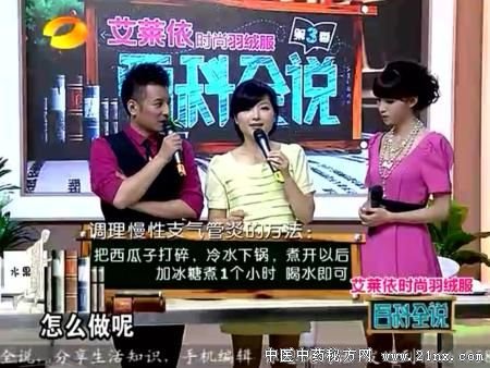 西瓜子冰糖茶 功效:可以调理慢性气管炎。 做法:把西瓜子打碎,冷水下锅。煮开以后,加冰糖,用小火煮1个小时,煮得浓浓的,然后趁热喝。每天喝3次,一个星期左右就能缓解。