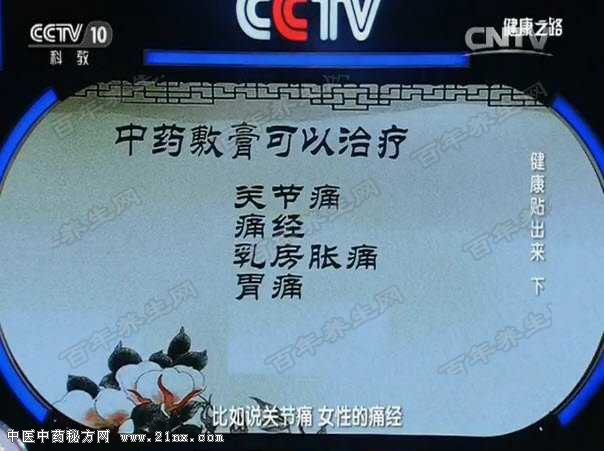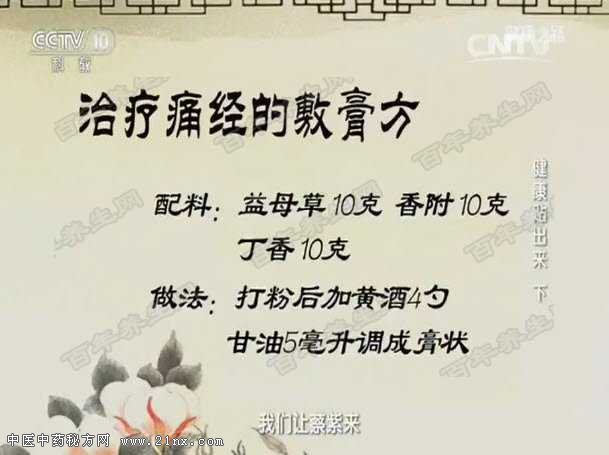 图:缓解痛经的帖敷膏 专家现场演示如何制作治疗痛经的敷膏。 女性痛经贴敷膏阶段不应吃什么?苦菊?黄瓜?萝卜? 正确答案是:女性痛经贴敷膏阶段不应吃苦菊。痛经主要是寒证引起的,苦菊是寒凉的,可能加重痛经的程度。另外女性不应穿露脐装,也不应吃寒凉的食物。 代金刚博士现场演示宝宝肚子胀怎么办:将花椒、八角打成粉用蜂蜜调成膏状贴在中脘穴。 习惯性便秘中老年非常多见,中医认为跟肠道的津液减少有关。将生大黄5克、枳实15克、火麻仁10克打粉制成帖敷膏贴在神阙穴针对实证导致的便秘效果非常好。