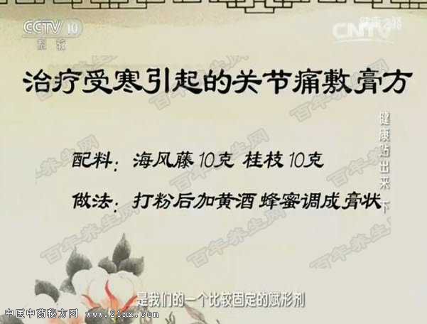 图:帖敷可以治疗的疾病有哪些 关节疼受寒只是其中的因素之一,中医认为外邪有六种,关节疼痛是由风寒湿三邪共同导致的。帖敷对缓解关节疼痛有效。 用海风藤(去风湿)、桂枝(温经、散寒)加上一味药引子即可缓解疼痛。 受寒引起的关节痛应用哪种酒调制敷膏?白酒?黄酒?米酒? 正确答案是:受寒引起的关节痛应用黄酒调制敷膏。白酒燥热,对人体皮肤有刺激,黄酒酒精度数相对适中,比较温和,也比较养人,还能温经通络引药入里。 将海风藤、桂枝各10克按昨天节目的制作方法制作敷膏即可。如果没有蜂蜜可以换成香油或橄榄油。