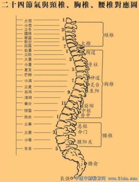 现代医学认为,脊柱是人体最大的能量传输中心,通过神经系统的传递,可与人体五脏六腑相通。人体的脊柱由颈椎7节,胸椎12节,腰椎5节共24节椎体组成,恰与一年24个节气相吻合。据《黄帝内经》所载,人体每一个器官的能量,都是由特定的脊椎位置所控制,与大自然24个节气所对应。当节令交替时,能量会大量流失,使身体免疫功能降低,久而久之,导致慢性病和机体老化。所以,采取适当的方法,在节令交替时段调理相对应的椎体(穴位),可以获得良好的养生保健效果。 天人合一,天人相应,是中国古代最著名的哲学观点之一,也是传统中医的基本指导思想。在这种思想指导下,人体与宇宙天体的运行互相感应,信息相通,与大自然的万千变化紧密联系。节令交替的一瞬间虽然时间很短,但足可以对人体的生命活动造成深远的影响,所以,巧妙地利用这一时段养生保健,可以收到事半功倍的效果。其具体操作方法是: 1、在每个节气来前15分钟开始静坐,意念集中于脊柱上所对应的椎体(穴位),时间共半小时左右; 2、每个节气交替之时,在对应脊椎(穴位)上香熏10~20分钟; 3、从每个节气的前三天开始,每天在脊柱上所对应部位用太极指调理10~20分钟,或在手部脊柱反射区所对应的部位上点按,每天1~2次,连做6天。 4、体弱或患病者在节令交替之时,可香熏肚脐半小时左右,对增强体质,恢复健康很有益处。 上述方法每人可根据自己的实际情况灵活选用。 24节气交替时间以及对应的脊椎(穴位)表