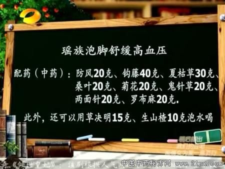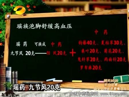 覃迅云博客 http://yyqxy.blog.163.com/blog/static/17940310520110313274956/ 瑶医覃迅云上湖南卫视百科全说节目介绍 高血压泡脚药方 瑶药:九节风20克(可换成防风20克)+钩藤40克+夏枯草30克+桑叶20克+菊花20克+鬼针草20克+两面针20克+罗布麻20克 中药泡茶喝治高血压的方子:草决明15克+生山楂10克