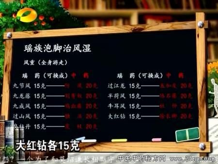 瑶族泡脚治湿重型风湿(固定地方痛)药方 配方 瑶药:两嘴刺、七叶风、九龙藤、四方风、小钻、过山风、鸟不站、南蛇藤、扁骨风各15克(可换成羌活、桂枝、川芎、防风、乌蛇、寄生、刘寄奴、威灵仙、透骨草各20克) 百科全说视频覃迅云 |