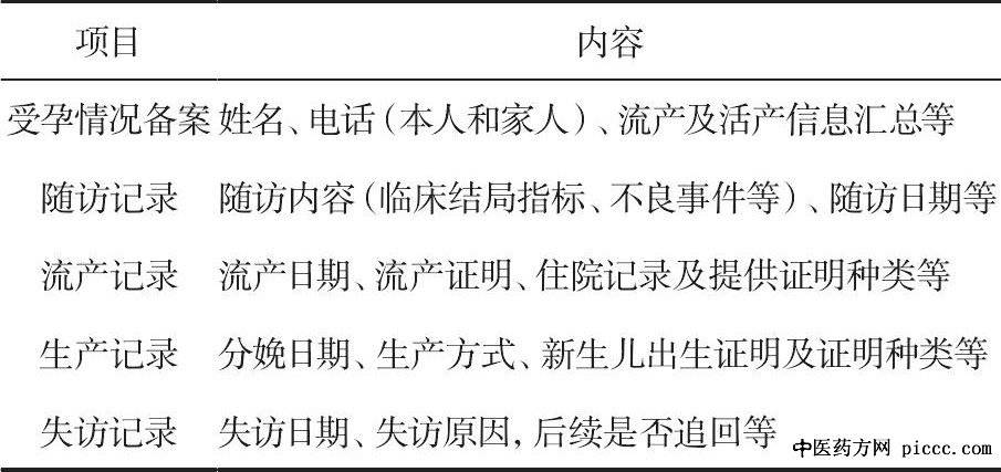 1.设立专人专职 (1) 妊娠随访人员应具备丰富的产科和新生儿的临床经验及良好的医患沟通能力, 在随访工作开展前, 随访专员需设定详尽的妊娠随访工作计划, 能够准确全面的判断和收集患者妊娠期间不良事件的发生, 提供正确有效的孕期指导和宣教。 (2) 临床试验的随访工作中, 专人随访模式优势显著, 如在提高受试者依从性, 降低受试者脱落率方面明显低于全科参与随访模式[25]。 (3) 专职专项的设立使得妊娠随访工作的执行一步到位, 避免了因职责分散、标准不统一而导致的管理混乱, 保证项目按计划、高效率的完成, 确保本项目后期数据统计的全面性、可靠性。 (4) 设立围产医疗小组, 由妊娠随访专员、高年资产科医生、新生儿医生组成。